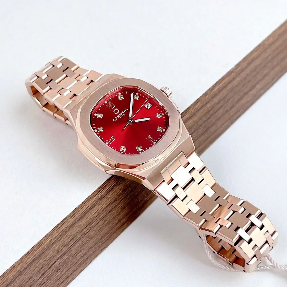 CARNIVAL 8160L-VH sử dụng chất liệu thép không gỉ 316L cao cấp cho cả phần vỏ và dây đeo, bền bỉ theo thời gian và chống lại các tác động từ môi trường thường ngày. Lớp mạ PVD vàng hồng tinh tế không chỉ mang lại vẻ ngoài sang trọng mà còn tạo điểm nhấn quyến rũ cho tổng thể thiết kế.